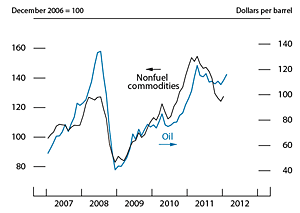 Note: The data are monthly. The oil price is the spot price of Brent crude oil, and the last observation is the average for February 1-24, 2012. The price of nonfuel commodities is an index of 45 primary-commodity prices and extends through January 2012.