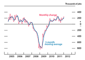 Labor market conditions have improved. The unemployment rate moved down from around 9 percent over the first eight months of 2011 to 8-1/4 percent in January 2012. However, even with this improvement, the jobless rate remains quite elevated. Furthermore, the share of the unemployed who have been jobless for more than six months, although down slightly from its peak, was still above 40 percent in January--roughly double the fraction that prevailed during the economic expansion of the previous decade. Meanwhile, private payroll employment gains averaged 165,000 jobs per month in the second half of 2011, a bit slower than the pace in the first half of the year, but gains in December and January were more robust, averaging almost 240,000 per month.