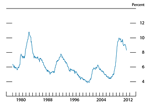 State and local governments remain under significant fiscal strain. Since July, employment in the sector has declined by an average of 15,000 jobs per month, just slightly under the pace of job losses recorded for the first half of 2011. Meanwhile, reductions in real construction expenditures abated after a precipitous drop in the first half of 2011. As measured in the NIPA, real state and local expenditures on consumption and gross investment decreased at an annual rate of about 2 percent in the second half of 2011, a somewhat slower pace of decline than in the first half of the year (figure 8).