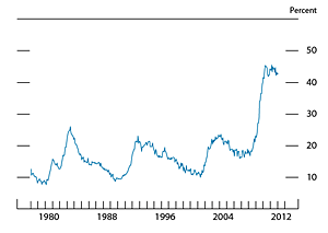 Federal debt surged in the second half of 2011, after the debt ceiling was raised in early August by the Budget Control Act of 2011.7 Standard and Poor's (S&P), which had put the U.S. long-term sovereign credit rating on credit watch negative in June, downgraded that rating from AAA to AA+ following the passage of the act, citing the risks of a continued rise in federal government debt ratios over the medium term and declining confidence that timely fiscal measures necessary to place U.S. public finances on a sustainable path would be forthcoming. Other credit rating agencies subsequently posted a negative outlook on their rating of U.S. sovereign debt, on similar grounds, but did not change their credit ratings. These actions do not appear to have affected participation in Treasury auctions, which continued to be well subscribed. Demand for Treasury securities was supported by market participants' preference for the relative safety and liquidity of such securities. Bid-to-cover ratios were within historical ranges, and indicators of foreign participation remained near their recent levels. Federal debt held by the public, as a percentage of GDP, continued to rise in the third quarter, reaching about 68 percent.