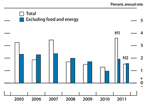 Consumer price inflation stepped down in the second half of 2011. After rising at an annual rate of 3-1/2 percent in the first half of the year, prices for personal consumption expenditures (PCE) rose just 1-1/2 percent in the second half. PCE prices excluding food and energy also decelerated, rising at an annual rate of roughly 1-1/2 percent in the second half of 2011, compared with about 2 percent in the first half. The decline in inflation was largely in response to decreases in global commodity prices following their surge early in 2011, as well as a restoration of supply chains for motor vehicle production that had been disrupted after the earthquake in Japan and some deceleration in the prices of imported goods other than raw commodities.
