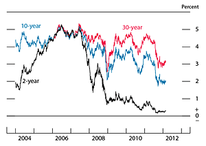 In response to a pace of economic growth that was somewhat slower than expected, the Federal Reserve provided additional monetary policy accommodation during the second half of 2011 and early 2012. Partly as a result, Treasury yields moved down significantly, and market participants pushed out the date at which they expect the federal funds rate to move above its current target range of 0 to 1/4 percent and built in expectations of a more gradual pace of increase in the federal funds rate after liftoff.