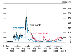 Measures of the profitability of the U.S. banking industry have edged up, on net, since mid-2011, as indicators of credit quality continued to show signs of improvement and banks trimmed noninterest expenses. Meanwhile, banks' regulatory capital ratios remained at historically high levels, as authorities continued to take steps to enhance their regulation of financial institutions. Nonetheless, conditions in unsecured interbank funding markets deteriorated. Strains were particularly evident for European financial institutions, with funding costs increasing and maturities shortening, on balance, as investors focused on counterparty credit risk amid growing anxiety about the ongoing crisis in Europe. Given solid deposit growth and modest expansion in bank credit across the industry, most domestic banks reportedly had limited need for unsecured funding.