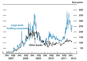 Throughout the second half of 2011 and early 2012, participants in financial markets focused on the fiscal and banking crisis in Europe. Concerns regarding the potential for spillovers to the U.S. economy and financial markets weighed on investor sentiment, contributing to significant volatility in a wide range of asset prices and at times prompting sharp pullbacks from risk-taking. Strains eased somewhat in a number of financial markets in late 2011 and early this year as investors seemed to become more confident that European policymakers would take the steps necessary to address the crisis. The more positive market sentiment was bolstered by recent U.S. data releases, which pointed to greater strength, on balance, than investors had expected. Nonetheless, market participants reportedly remain cautious about risks in the financial system, and credit default swap spreads for U.S. financial institutions have widened, on net, since early last summer.