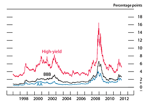 Borrowing by nonfinancial corporations continued at a reasonably robust pace through the second half of 2011, particularly for larger, higher-credit-quality firms. Issuance of investment-grade bonds progressed at a strong pace, similar to that observed in the first half of the year, buoyed by good corporate credit quality, attractive financing conditions, and an improving economic outlook. In contrast to higher-grade bonds, issuance of speculative-grade bonds dropped in the second half of the year as investors' appetite for riskier assets waned. In the market for syndicated loans, investment-grade issuance moved up in the second half of 2011 from its already strong first-half pace, while issuance of higher-yielding syndicated leveraged loans weakened.