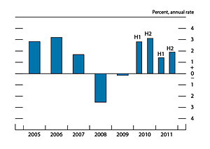 Real gross domestic product (GDP) increased at an annual rate of 2-1/4 percent in the second half of 2011, according to the advance estimate prepared by the Bureau of Economic Analysis, following growth of less than 1 percent in the first half (figure 1). Activity was held down in the first half of the year by temporary factors, particularly supply chain disruptions stemming from the earthquake in Japan and the damping effect of higher energy prices on consumer spending. As the effects of these factors waned over the second half of the year, the pace of economic activity picked up. But growth remained quite modest compared with previous economic expansions, and a number of factors appear likely to continue to restrain the pace of activity into 2012; these factors include restricted access to credit for many households and small businesses, the depressed housing market, tight fiscal policy, and the spillover effects of the fiscal and financial difficulties in Europe.