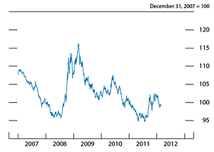 The fiscal and banking crisis in Europe was a primary focus of financial markets over the course of the second half of 2011 and early 2012. Growing concerns regarding the potential for spillovers to the U.S. economy and financial markets weighed on investor sentiment, contributing to significant volatility in a wide range of asset prices. Nonetheless, developments in financial markets have been mixed, on balance, since July. Unsecured dollar funding markets became significantly strained, particularly for European institutions, though U.S. institutions generally did not appear to face substantial funding difficulties. Risk spreads on corporate debt stayed elevated, on net, but yields on corporate bonds generally moved lower. Broad equity prices, which declined significantly in July and August, subsequently returned to levels near those seen in early July. Credit conditions for most large nonfinancial firms were accommodative and corporate profit growth remained strong.