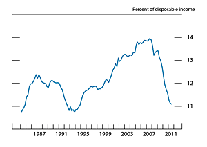 Note: The data are quarterly and extend through 2011:Q3. Debt service payments consist of estimated required payments on outstanding mortgage and consumer debt.