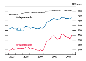 Interest rates on fixed-rate mortgages fell steadily during the second half of 2011 and in early 2012 (figure 5), though not as much as Treasury yields, leaving spreads to Treasury securities of comparable maturities wider. The ability of potential borrowers to obtain mortgage credit for purchase transactions or refinancing continued to be limited. In part, the low level of mortgage borrowing reflected characteristics of the would-be borrowers, most prominently the widespread incidence of negative equity and unemployment. In addition, credit supply conditions remained tight. Indeed, it appeared that some lenders were reluctant to extend mortgages to borrowers with less-than-pristine credit even when the resulting loans would be eligible for purchase or guarantee by GSEs.6 One manifestation of this constriction was the fact that the distribution of credit scores among borrowers who succeed in obtaining mortgages had shifted up significantly (figure 6). As a result of these influences, the pace of mortgage applications for home purchase declined, on net, over the second half of 2011 and remains very sluggish. The same factors also appear to have limited refinancing activity, which remains subdued compared with the large number of households that would potentially benefit from the low rates available to high-quality borrowers.