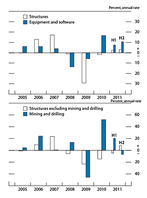 After tumbling throughout most of 2009 and 2010, real investment in nonresidential structures other than drilling and mining turned up last spring, rising at a surprisingly brisk pace in the second and third quarters of 2011. However, investment dropped back in the fourth quarter. Conditions in the sector remain difficult: Vacancy rates are still high, prices of existing structures are low, and financing conditions for builders are still tight. Spending on drilling and mining structures also dropped back in the fourth quarter, but outlays in this category should continue to be supported by elevated oil prices and advances in technology for horizontal drilling and hydraulic fracturing.