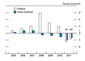 As measured in the national income and product accounts (NIPA), real federal expenditures on consumption and gross investment--the part of federal spending that is a direct component of GDP--decreased at an annual rate of about 3 percent in the second half of 2011, a little less rapidly than in the first half of the year (figure 8). Defense spending fell at an annual rate of about 4 percent in the second half of the year, a somewhat sharper pace of decline than in the first half, while nondefense purchases were unchanged over this period.