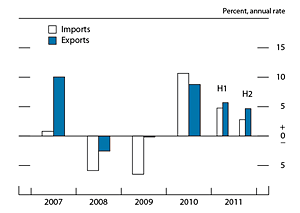 With growth of economic activity in the United States moderate during the second half of 2011, real imports of goods and services rose at only about a 3 percent annual rate, down from about 5 percent in the first half. Import growth was weak across most trading partners in the second half of last year, with the notable exception of imports from Japan, which grew significantly after dropping sharply in the wake of the March earthquake.