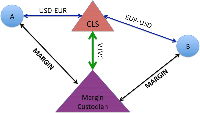 Figure 9 illustrates a potential approach that I have proposed for obtaining an economic effect similar to that of clearing for those FX derivatives that are settled at CLS Bank. As the dollar-Euro contract increases in market value to Bank A through fluctuations in currency prices, variation margin payments are collected from Bank B by a special-purpose financial utility. The financial utility could be operated by a traditional central clearing party (CCP) or by CLS Bank. The margin payments are made in an agreed standard margin currency, such as U.S. dollars. If the market value of the position of Bank A subsequently declines, a corresponding amount of the margin that had been posted by Bank B is returned to Bank B.17