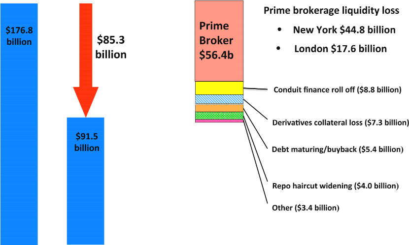 Figure 12, based on data provided by Morgan Stanley to the Federal Reserve Bank of New York,21 illustrates sources of reductions in the liquidity pool of Morgan Stanley in the period of days surrounding the failure of Lehman Brothers. The dominant source of loss in liquidity was through an effective run by Morgan Stanley's prime brokerage clients.