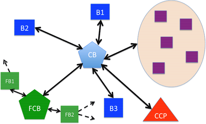 "Plumbing" is a common metaphor for institutional elements of the financial system that are fixed in the short run and enable flows of credit, capital, and financial risk. This institutional structure includes some big "valves and pipes" that connect central banks, dealer banks, money market funds, major institutional investors, repo clearing banks, over-the-counter (OTC) derivatives central clearing parties, and exchanges. The connectors include lending facilities offered by central banks to each other and to dealer banks, tri-party repo and clearing agreements, OTC derivatives master swap agreements, prime-brokerage agreements, and settlement systems arranged through FedWire, CHIPS, CLS Bank, DTC, the two main clearing banks for tri-party repurchase agreements, and other major custodians and settlement systems.