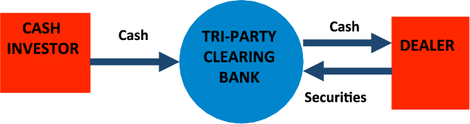 A repurchase agreement, or "repo," is in essence a secured loan.5 A delivery-versus-payment (DvP) repo is arranged through direct transfers between borrower and lender of cash and securities. A substantial quantity of repos are instead arranged in the tri-party market, which is serviced by two clearing banks, JP Morgan Chase and Bank of New York Mellon.