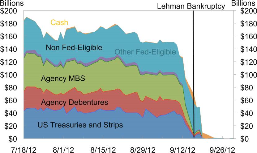 These weaknesses point to the importance of the liquidity of collateral used in the tri-party repo market. Currently, approximately 80% of the collateral used in the tri-party repo market consists of treasuries or agencies (including agency debentures, agency MBS, and agency collateralized mortgage obligations) that are eligible as collateral for financing from the Federal Reserve. The largest classes on non-Fed-eligible assets used in the tri-party market are corporate bonds and equities, which each constitute approximately 5% of the total, as of February 2012.11