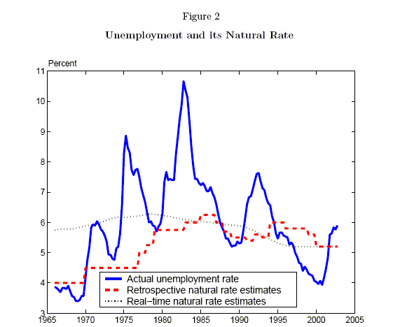 Examples from the 1970s illustrate the problem associated with adopting an activist approach to stabilization policy when one may be mistaken as to the size or even the sign of the unemployment (or output) gap in real time.10 Consider the policy error of the early 1970s. With unemployment rising during and after the recession that started at the end of 1969, and in light of available estimates of the natural rate of unemployment, policymakers could have reasonably held the view that the economy was operating with considerable slack. The activist policy prescription at the time was clear cut: pursue additional monetary expansion to bring the unemployment rate down. Moreover, the existing slack should have led to some welcome disinflation despite the additional stimulus. Indeed, such a policy was pursued at the time. But, based on the retrospective estimates of the natural rate, it is now clear that that policy prescription represented a large error. The economic expansion pursued in 1971-73 pushed aggregate demand far above the economy's potential, as this is currently understood, fueling an increase in inflation. A similar error occurred after the 1975 recession, contributing to a further rise in inflation.