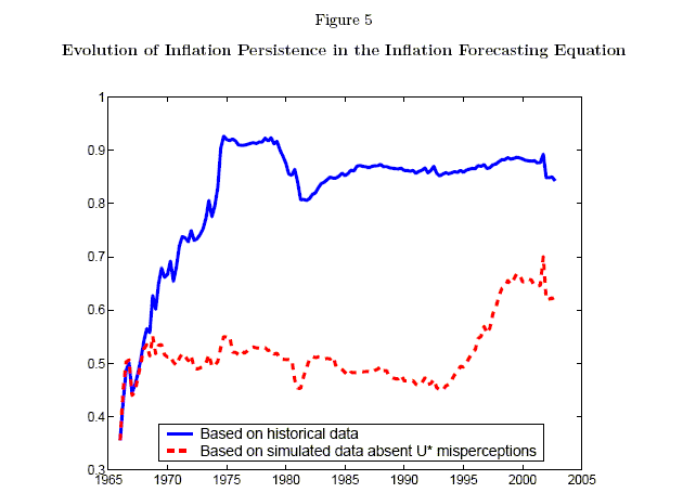 21. This rise in perceived inflation persistence in our model is a manifestation of the real-world accumulation of evidence against the hypothesis of a long-run tradeoff between unemployment and inflation and in favor of the ``accelerationist'' view during the 1970s. Return to text