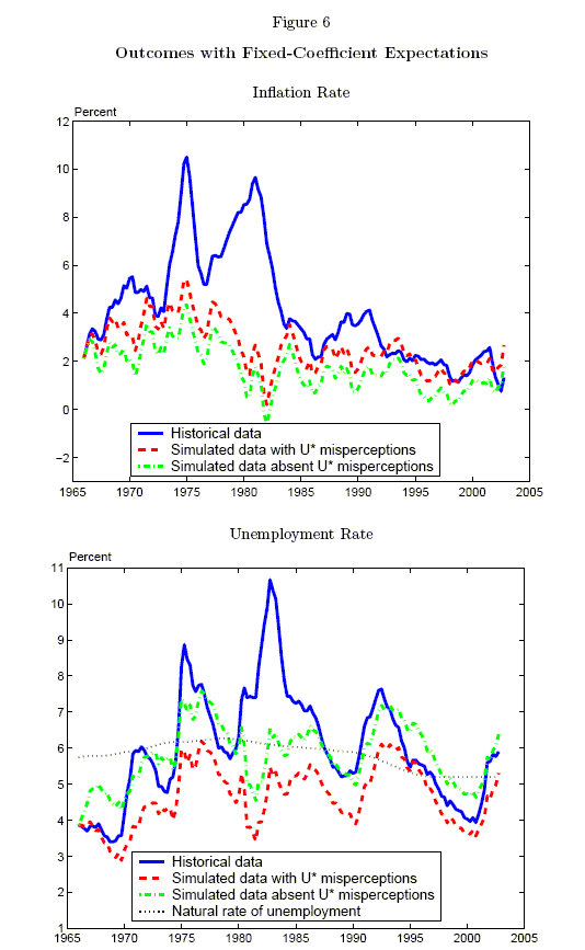 According to our model, the combination of stimulative monetary policy and rising inflation during the late 1960s and 1970s contributed to public confusion regarding the Federal Reserve's objectives and the behavior of inflation. Although inflation expectations were initially well-anchored owing to the period of price stability in the 1950s and early 1960s, this advantage was squandered during the late 1960s as policy errors and the resulting rise in inflation caused inflation expectations to drift upward. By the time that the supply shocks of the 1970s hit, inflation expectations were already unmoored, exacerbating the response to the shocks and contributing to stagflation. It is worth noting that our results do not rely on policy being inherently destabilizing in the pre-1979 period, as emphasized by Clarida, Gali, and Gertler (2000). In fact, the feedback rule that we estimate for the pre-1979 period based on real-time data features a greater than one-for-one response of nominal rates to inflation. What is crucial is that policy responded strongly to perceived unemployment rate gaps during that period.