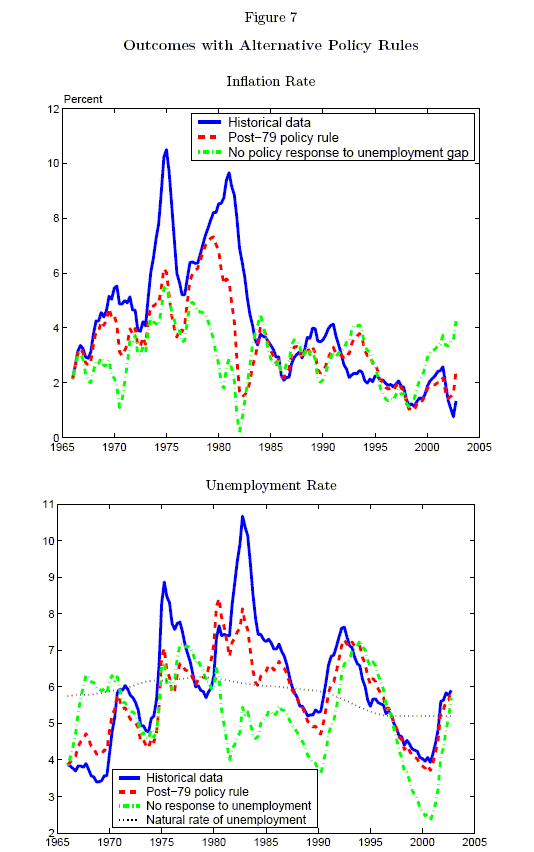 Notes: The two panels show historical and simulated paths of the rates of inflation and the unemployment. The paths shown by the solid lines are based on the historical data. The dashed lines show the simulated paths in which monetary policy follows the post-1979 policy rule. The dash-dot lines show the simulated paths when policy does not respond to the unemployment gap. Each simulation starts in the first quarter of 1966.