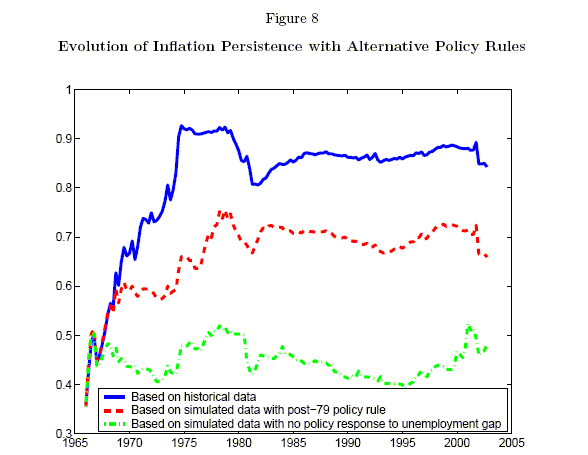 Notes: The lines show the simulated paths of the estimated coefficient on lagged inflation in agents' inflation forecasting equations, which reflects agents' perceptions of inflation persistence. The path shown by the solid line is based on the historical data. The dashed line shows the simulated path in which monetary policy follows the post-1979 policy rule. The dash-dot line shows the simulated path when policy does not respond to the unemployment gap. Each simulation starts in the first quarter of 1966.