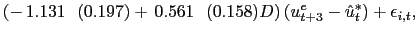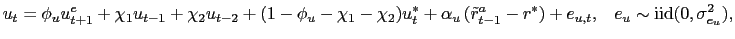 The numbers in parentheses are the estimated standard errors of the corresponding regression coefficients. The estimated unemployment equation also includes a constant term that provides an estimate of the natural real interest rate plus the average premium of the one-year Treasury bill rate we use for estimation over the federal funds rate, which corresponds to the natural rate of interest estimates we use in the model. If this premium equals the average difference between the one-year rate and the federal funds rate during this sample, then the estimation suggests that the natural rate of interest in this sample is 3.2 percent. To complete our model for simulations, we impose the expectations theory of the term structure whereby the one-year rate equals the expected average of the federal funds rate over four quarters.