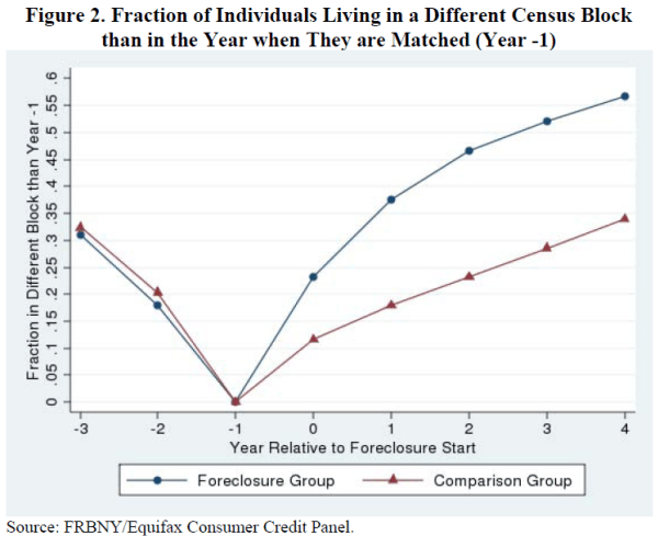 Figure 2 shows the fraction of individuals that live in a different Census block than in the year prior to foreclosure start, which is shown as year -1 on the x axis. For the comparison group, year -1 is the year in which an individual was matched to someone in the foreclosure group. Note that the mobility rates of the foreclosure and comparison groups in years before year -1 are almost identical. Such similarities reassure us that the comparison group provides a reasonable counterfactual for the post-foreclosure individuals.