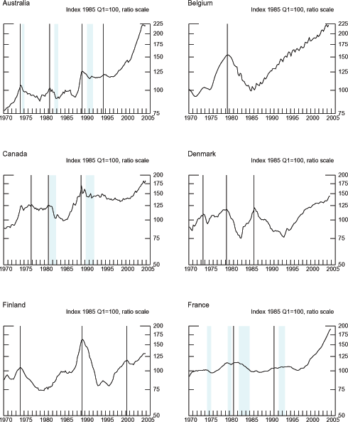 2. Our data on house prices come from the Bank for International Settlements (BIS) and are derived from national sources (see data appendix and table A1). The frequency for which the house price data are available varies by country and over time. Both annual and semi-annual data are interpolated by the BIS to derive quarterly series. In addition, the data quality varies substantially among the countries, and for some countries the sample changes in significant ways over the time covered. For example, a close look at the series for Belgium, Italy, France, and Spain indicates significant differences between the volatility and trends in the early part of the series and those in the latter part of the series. These data issues led us to focus on the longer trends in house prices (such as the behavior around peak dates) rather than quarter-to-quarter movements in the indexes. Return to text