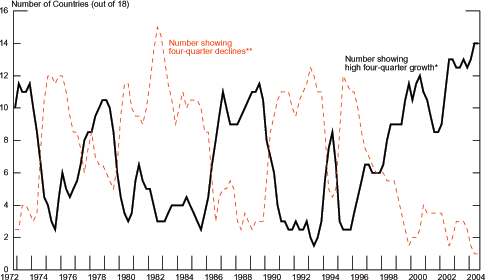 * Two-quarter moving average of the number of countries experiencing high four-quarter growth rate of real house prices. High growth rate is defined as four-quarter growth rate greater than two times each country's average four-quarter growth rate between 1970 and 2004.