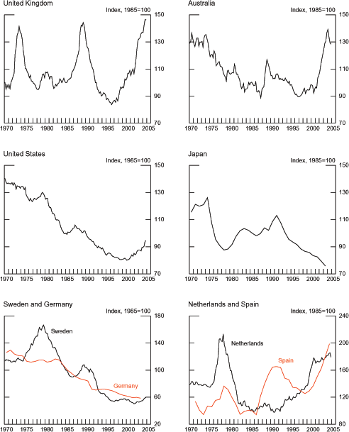 Chart 2.3 shows ratios of nominal house prices to disposable income for eight countries.6 Using this measure to determine the valuation of housing is complicated by the fact that the ratio seems to trend in a number of countries. Although the ratio appears to be mean-reverting in the United Kingdom, Australia and the Netherlands, it seems to have trended down in the United States, Germany, Japan, Sweden and Australia, at least until 2001. In contrast, the ratio has trended up in Spain. Large deviations from trend tend to coincide with sharp movements in house prices, and these deviations eventually seem to be reversed. All the countries shown, with the exception of Germany and Japan, have ratios of house prices to disposable income that are above what would have been predicted based on their trends; however, recent movements of the U.K. and Australian ratios stand out. In both of these countries, these ratios are near record highs. The increase in these ratios (relative to trend) raises concerns over the sustainability of house prices, particularly in the United Kingdom and Australia.