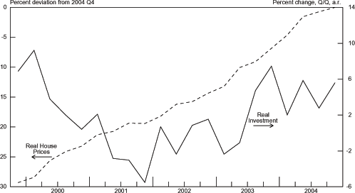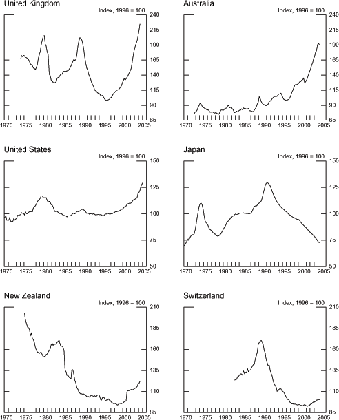 Nowhere has the debate been more public than in the United Kingdom, where house prices have almost tripled over the past nine years, with the largest gains occurring from late 2001 through the first half of 2004 (chart 4.2, upper panels). Starting in November 2003, the Monetary Policy Committee (MPC) of the Bank of England gradually raised the repo rate 125 basis points, to 4.75 percent. In its minutes and in most members' speeches that address those rate increases, the MPC states that it looks at house prices (and asset prices more generally) only to the extent that they provide information relevant to future output growth and inflation.19