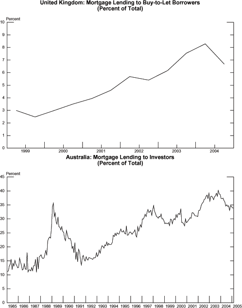 Data on investment properties are not available for most countries. However, the data we do have indicate that in some countries these types of purchases have increased over the past several years. Chart 2.5 shows the volume of "buy-to-let" lending as a percentage of total mortgage lending in the United Kingdom and lending to investors as a percentage of total mortgage lending in Australia. Data for the United Kingdom are semi-annual and go back only to 1999. Since then, buy-to-let lending has increased from about 3 percent of total mortgage lending to around 7 percent. The decline in this ratio in the second half of 2004 coincides with slowing appreciation of U.K. house prices. For Australia, a longer time series is available on a monthly basis. Lending to investors increased from around 15 percent of total mortgage lending in 1992 to nearly 40 percent at the end of 2003, surpassing its previous high around the time of the 1989 house price peak; but it has since declined to around 34 percent with the sharp slowdown in house prices. However, we doubt that all the variation can be attributed to speculative activity because much of the increase predated the period of rapidly rising house prices. In addition, the recent increase was nowhere near as dramatic as the sharp one that occurred in 1989.