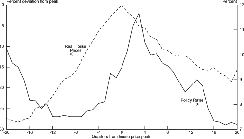 House price booms are typically preceded by a period of easing monetary policy, with policy rates bottoming out about the same time that house prices take off, about three years before house prices peak. Policy rates remain low for a little more than a year but then rise steadily through the years before and after the house-price peak, during which CPI inflation continues to rise. Rates then reverse quickly in response to falling GDP growth, widening output gaps, and lower inflation. Broad money growth is generally higher before the peak than afterward.