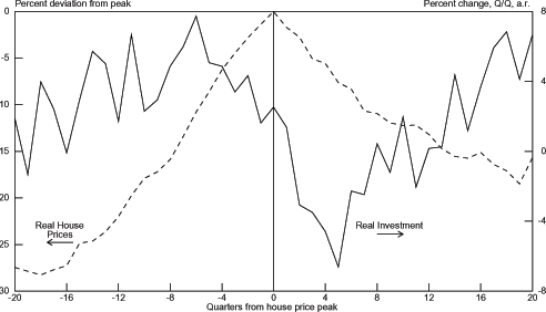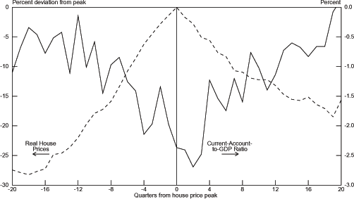 Current account: The current account deficit, shown in chart 3.11, begins to widen noticeably at least eight quarters before the crest in house prices, reaching about 2½ percent of GDP in quarter 0. The deficit widens a bit more immediately following the peak and then begins to shrink gradually as house prices decline, with the current account balance close to zero by the time real house prices stabilize around quarter 20. The adjustment in the current account reflects the slump in investment and the rise in household saving rates during the economic downturn following the peak in house prices.