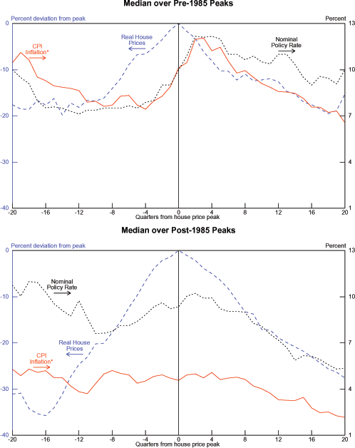 Our full sample extends back to 1970 and so covers the high inflation period of the 1970s and early 1980s as well as the relatively low inflation period since about 1985. As we note below, many countries deregulated their mortgage markets during the early to mid-1980s. As a check on the robustness of our findings across these very different periods, we examine the behavior of indicators around house price peaks in the pre-1985 period and in the period from 1985 onward (post-1985) separately. For most indicators, the results for the pre-1985 and post1985 samples are broadly similar. Perhaps not surprisingly, the largest differences between our two subsamples are in the behavior of median inflation and nominal policy interest rates. Whether these differences reflect changes in the behavior of inflation and policy rates around house price peaks or around business cycle peaks is not clear, however, given the close association between real house prices and economic performance.