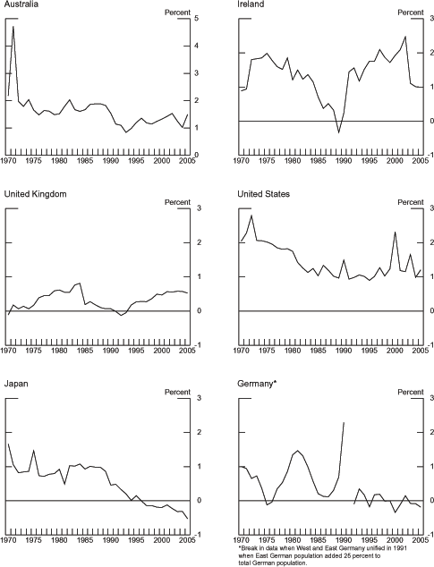 Demographic factors appear to have played a role in the differing patterns of house price movements across countries. As shown in chart 3.13, growth rates in the working-age population have picked up since the early 1990s in several countries that have experienced large run-ups in house prices in recent years, including Australia, Ireland, the United Kingdom, and the United States. For example, Ireland's annual population growth averaged about 1¾ percent over the past decade and boosted the demand for houses. In Australia, Canada, Ireland, New Zealand and the United States, high rates of immigration have helped drive population growth. In contrast, the declines in house prices in Japan and Germany over the past decade were concurrent with dramatic slowdowns in population growth, with populations actually declining in recent years.