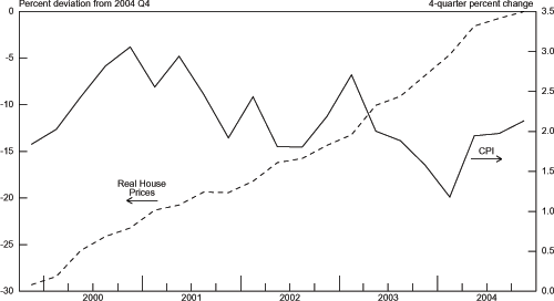 In December 2003, the British government changed the MPC's targeted inflation series from a series that includes imputed rents, the RPIX, to a series that does not, the CPI, and also adjusted its inflation target from 2½ percent to 2 percent.21 Imputed rents in the RPIX are calculated using a house price index. At the time of the switch, the MPC said that policy would be unaffected by the change in the target series, despite the exclusion of house prices, because it expected house price growth to abate in the medium run.
