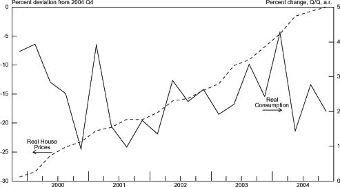 19. From the MPC minutes, May 2004: "In presenting its decision to raise the repo rate, it would be important for the Committee to make clear that this did not imply that it was targeting house price inflation, or any other asset price. The significance of the unexpected acceleration in house prices was that it supported a stronger short-term outlook for consumption and output growth, and hence a steeper projected rise in inflation." Also see King (2004), Lomax (2004), and Barker (2005). Return to text