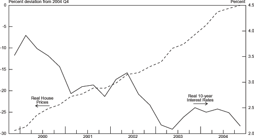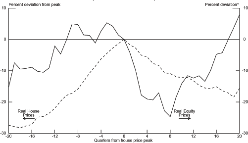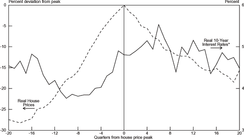Co-movement with other long-term asset prices is also a feature of house price cycles. In past episodes, real long-term interest rates tended to be at a low about two years before real house prices peaked, increased as the peak approached, and continued to rise for several quarters after the peak before gradually trending down. Real equity prices tended to peak four to eight quarters before real house prices.