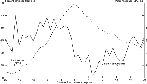 Chart 3.5: Real Consumption Growth and Real House Prices (Median over All Peaks)