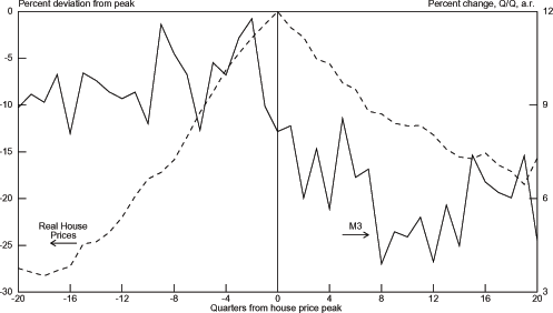 Money supply growth: As shown in chart 3.8, growth in M3, although volatile, appears considerably lower on average in the period after the peak in house prices than in the period before the peak. This result is not surprising because growth in M3 is positively correlated with growth in real GDP and household borrowing.