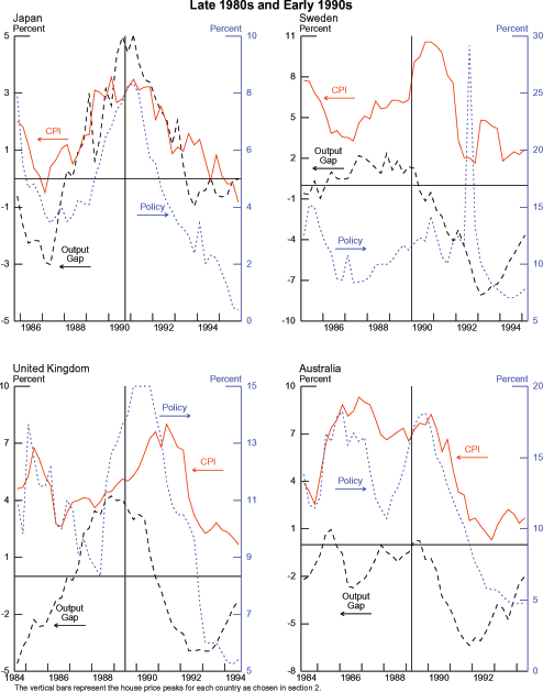 In the rest of this section we explore central banks' own descriptions of their actions, which may be a better indicator of the importance of house prices in the formulation of monetary policy. We focus on six important episodes--in Japan, Sweden, the United Kingdom, and Australia in the late 1980s and early 1990s (chart 4.1) and in Australia and the United Kingdom in recent years (chart 4.2)--as well as some recent speeches by central bankers from other foreign countries. The early episodes suggest that central banks in these countries focused primarily on inflation and exchange rates and paid relatively little attention to residential or commercial property prices. The recent speeches suggest that the debate about how central banks should react to house and other asset price swings is still an open one, with some foreign central bankers willing to shift the stance of monetary policy if it would restrain substantial and abnormally rapid rises in asset prices.