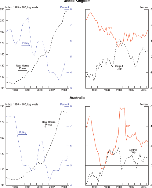 Some central bankers argue that, although central banks should not target asset prices, they should look at the effects of the prices on inflation and output beyond the central bank's usual policy horizon.25 In Australia, where annual house prices increased at a double-digit pace during the past several years, the RBA has raised its cash rate 125 basis points, starting in May 2002 (chart 4.2, lower panels). Although RBA Governor Ian Macfarlane (2004) said that house prices "are not appropriate targets for monetary policy" and Deputy Governor Glenn Stevens noted that central bankers should look at asset prices only for the information that they give us about the evolution of the macroeconomy, Stevens (2004) further cautioned that policy makers should not be confined to looking at their effects only at a one- or two-year horizon. The distinction between this position and "leaning against the wind" is quite subtle: In practice, monetary policy might look similar even though the rationale for it would be slightly different.