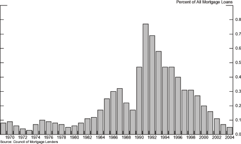 The notion that residential mortgage lending is a low-risk activity generally is supported by some of the recent historical experience with banking system stress associated with declines in property prices. In particular, Japan, Sweden, and Norway experienced significant financial system stress in the early 1990s, including (at least de facto) major bank insolvencies. Although declines in the value of commercial property collateral were a factor in these episodes, residential mortgage lending was not. In the United Kingdom around the same time, however, household mortgage lending was an important component of the challenges confronting depository institutions. For example, chart 5.1 shows that mortgage repossessions rose in 1991-93 to nearly ten times their typical level in the 1970s. However, the major banks and building societies withstood the test fairly well. Even at their peak, foreclosure rates remained below 1 percent per year and, with substantial recoveries from re-selling repossessed properties, actual credit losses incurred by the lenders were an even smaller fraction of their mortgage portfolios. U.K. mortgage lenders may be even less vulnerable today because a significant proportion of U.K. mortgage borrowers since 1998 have purchased private mortgage insurance.
