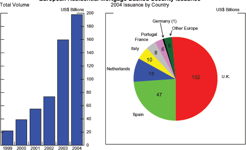 As a result of a well-developed market for residential mortgage-backed securities (RMBS), originators of U.S. mortgage lending need not retain significant exposure to borrowers or to the underlying collateral, and in practice less than one-third of U.S. mortgages are kept on the books of depository institutions.31 However, securitization of mortgages occurs to a much lesser degree in other countries. The upper panels of chart 5.2 show that mortgage securitization volumes in Europe have grown rapidly from very low levels in the 1990s, but with negligible levels of activity in major countries such as France and Germany.32 Even in the United Kingdom, which accounted for more than half of European issuance in 2004, the risk transfer from RMBS issued there last year was equivalent to only 19 percent of gross lending secured on dwellings, with the balance of mortgage exposure remaining on the books of the lenders.33