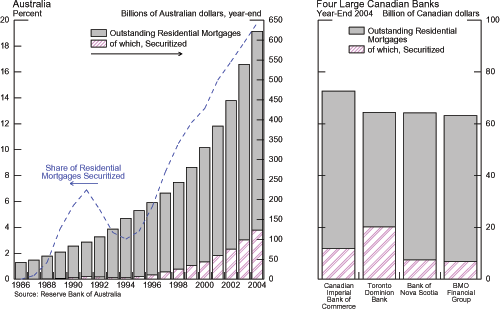 The lower panels of chart 5.2 reveal a similar state of affairs in Australia and Canada. The proportion of outstanding mortgages included in securitizations has grown steadily in Australia since the mid-1990s but still stands at only 19.8 percent. For the four major Canadian banks for which data could be obtained the equivalent aggregate figure is 17.5 percent.