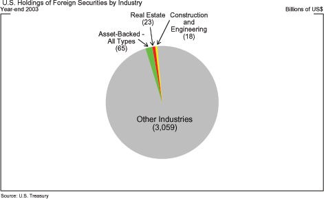 The lower panel, which is drawn from the Treasury International Capital (TIC) survey of international portfolio security holdings, shows that other U.S. investors also appear to have limited exposure to foreign real estate.34 Aggregate U.S. portfolio investment in the foreign construction and real estate industries amounted to only $41 billion at the end of 2003, a relatively trivial fraction of the more than $3 trillion in total foreign portfolio investment of U.S. investors. Foreign asset-backed securities (ABS) accounted for an additional $65 billion in U.S. holdings, but likely only a fraction of the underlying collateral is real estate-related.