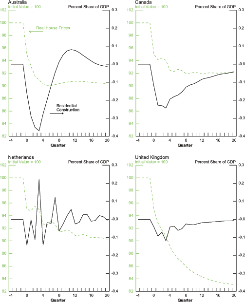35. Because the estimated correlation of residuals between the two equations is positive for each country, prices are assumed to have a contemporaneous effect on construction in the VAR ordering. For these countries, a 5 percent quarterly price decrease represents a shock ranging from about 1.9 to 2.7 standard deviations. Return to text