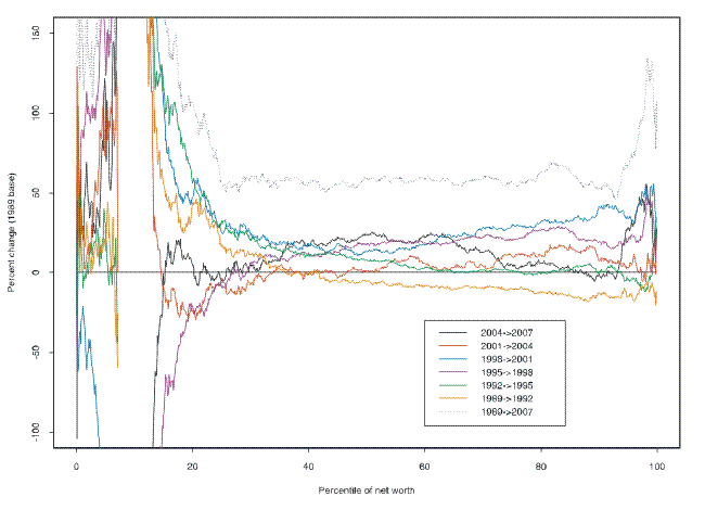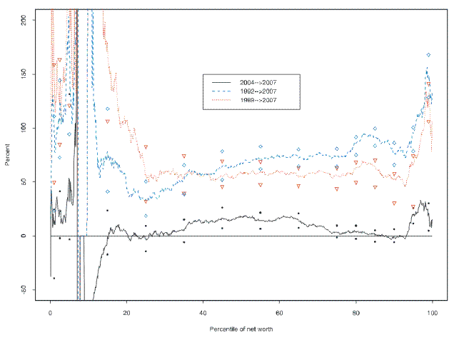 From 1989 to 2007 (the red line), the distribution of wealth rose on the order of 50 percent all across the broad center--from about the 20th percentile to the 75th percentile. This near uniformity stands in contrast to the two tails of the distribution. At the upper end, there is a "bump" around the 80th percentile followed by a spike leading up from about the 90th percentile. The bump does not appear to be an artifact of an anomaly in the 2007 or 1989 wealth distributions; a similar pattern is also seen in comparisons of the 2004 and 1989 data (see Kennickell [2006]) and in the 1992-2007 plot also shown in figure 1. At the very bottom of the distribution, wealth became significantly more negative over this period.20 The plot for the 1992-2007 period shows increasingly larger gains above about the 20th percentile than is the case for the change from a 1989 base; as shown by the gold line in figure 2, this result is a result of a decline for this group between 1989 and 1992. For the more recent period, the 2004-07 plot shows significant gains only in a narrower middle range and among the approximately the top 5 percent of the distribution.
